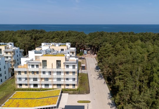 Osiedle tuż przy wydmie z niską i lekką architekturą zadziwia naturalnością. Zaledwie 150 m od plaży, lecz w zaciszu – parawan nadmorskiego lasu przyjemnie tłumi szum morza i wiatr. Wokół natura, czyste piękno.